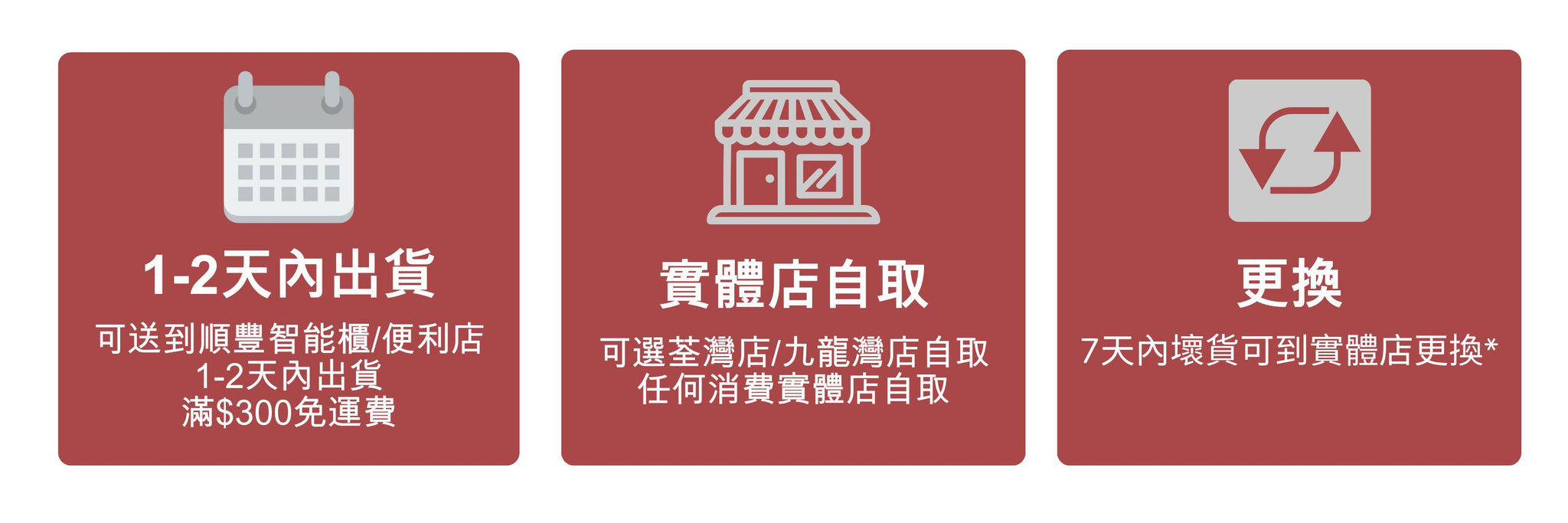 - 2. 以下貨品不設更換服務: 減價貨品、推廣期間的特價貨品、陳列品、個人護理用品包括但不限於牙刷、束髮帶、貼身服飾及手飾、易碎品包括但不限於玻璃及陶瓷產品,如貨品屬天然物料所造,與陳列品或其他存貨有任何差異,恕不退換/退款。